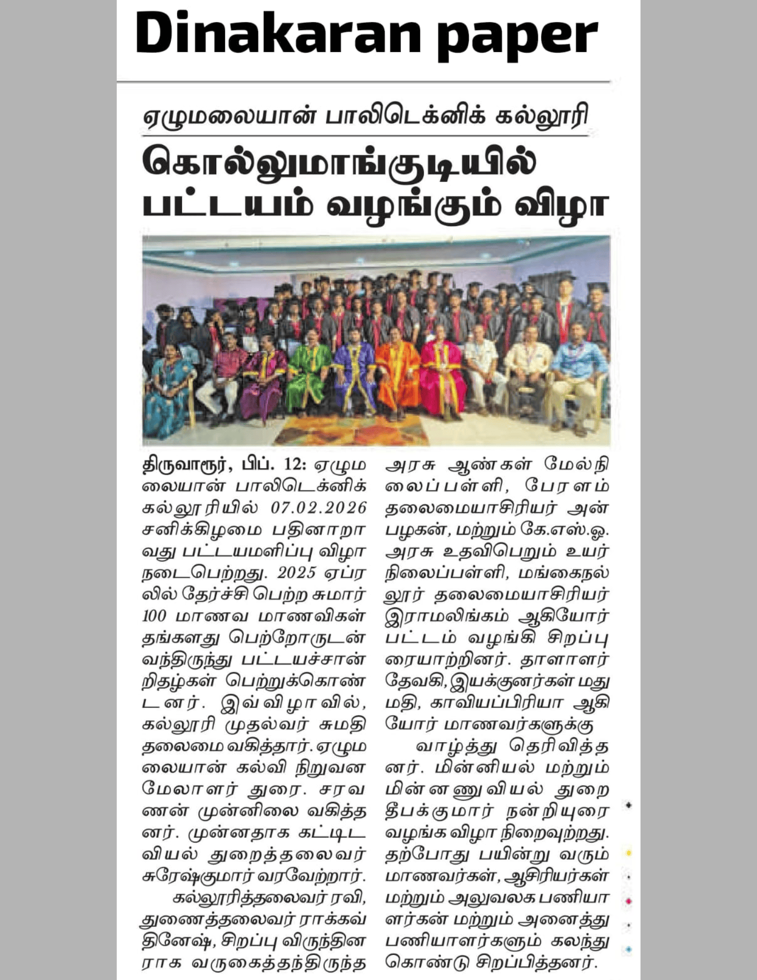 Established in 2007, Elumalaiyan Polytechnic College stands as a beacon of quality education in Thiruvarur, Tamil Nadu. Founded by Sri Mahalakshmi Educational Trust, the institution has evolved into a centre of academic excellence. Offering diploma courses in various engineering disciplines, we pride ourselves on providing affordable education